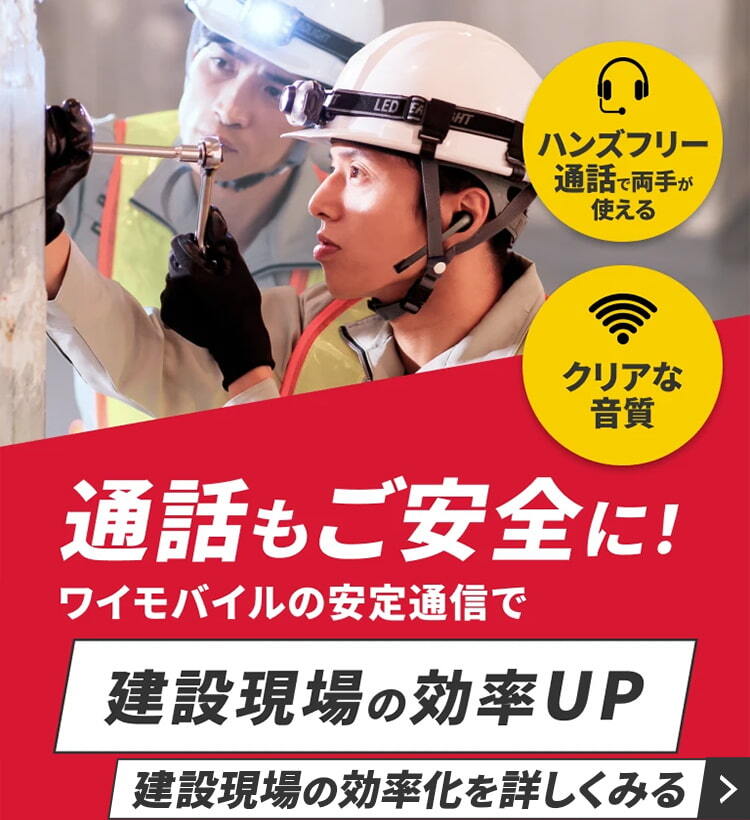 建設現場にワイモバイルの安定通信ワイモバイルはソフトバンクと同じネットワークなのでエリアが広く安定した高速通信。建設現場の騒音化でもハンズフリー通話機能により両手を自由に使える。クリアな音質で正確な情報伝達。円滑なコミュニケーションが建設現場を活性化します。