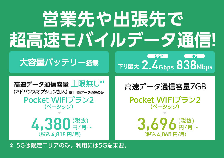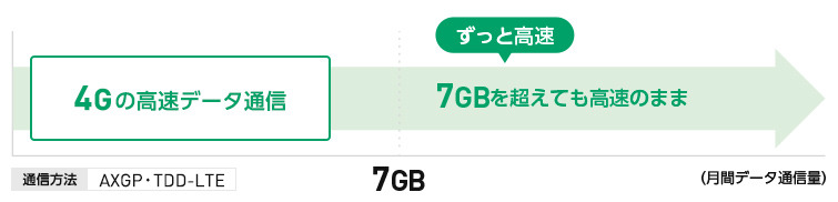 Pocket WiFi本体で「アドバンスモード」に設定することで、月間データ通信量の7GBを超えても通信速度制限なし。ずーっと4G高速データ通信がご利用できます。