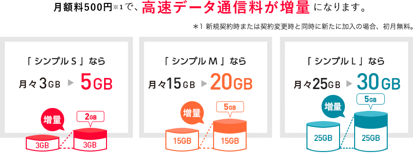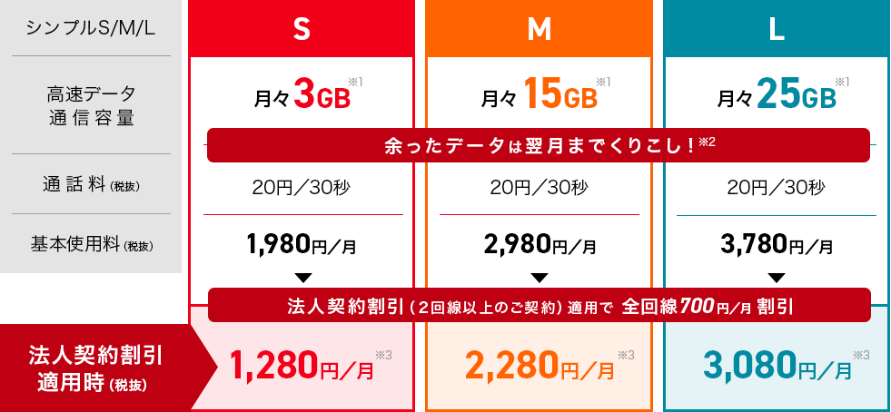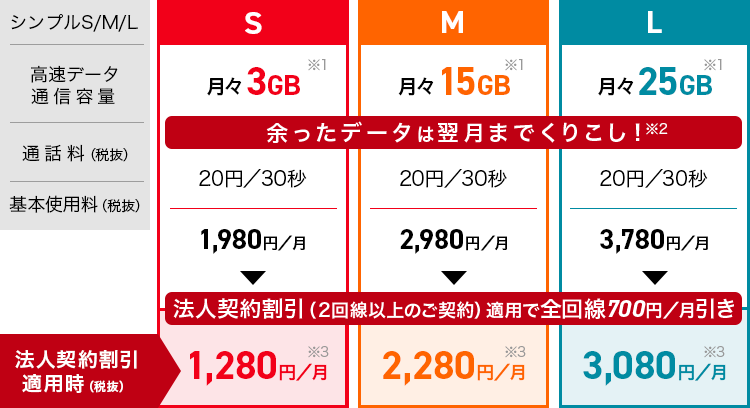 | 料金プラン | シンプル3 S | シンプル3 M | シンプル3 L |
