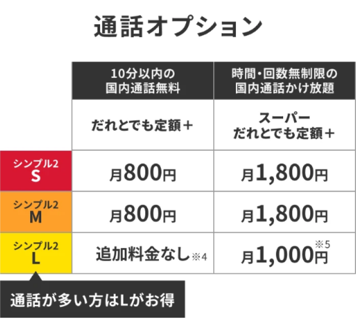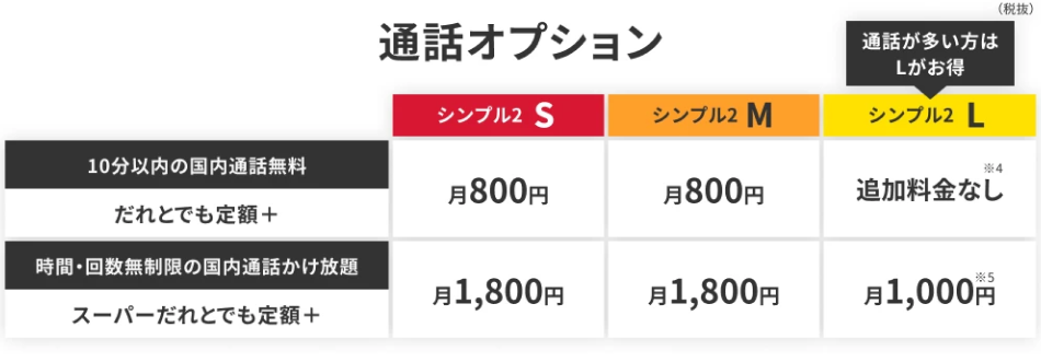 | 通話オプション | シンプル3 S | シンプル3 M | シンプル3 L |