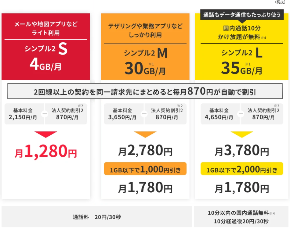 | 料金プラン | シンプル3 S | シンプル3 M | シンプル3 L |