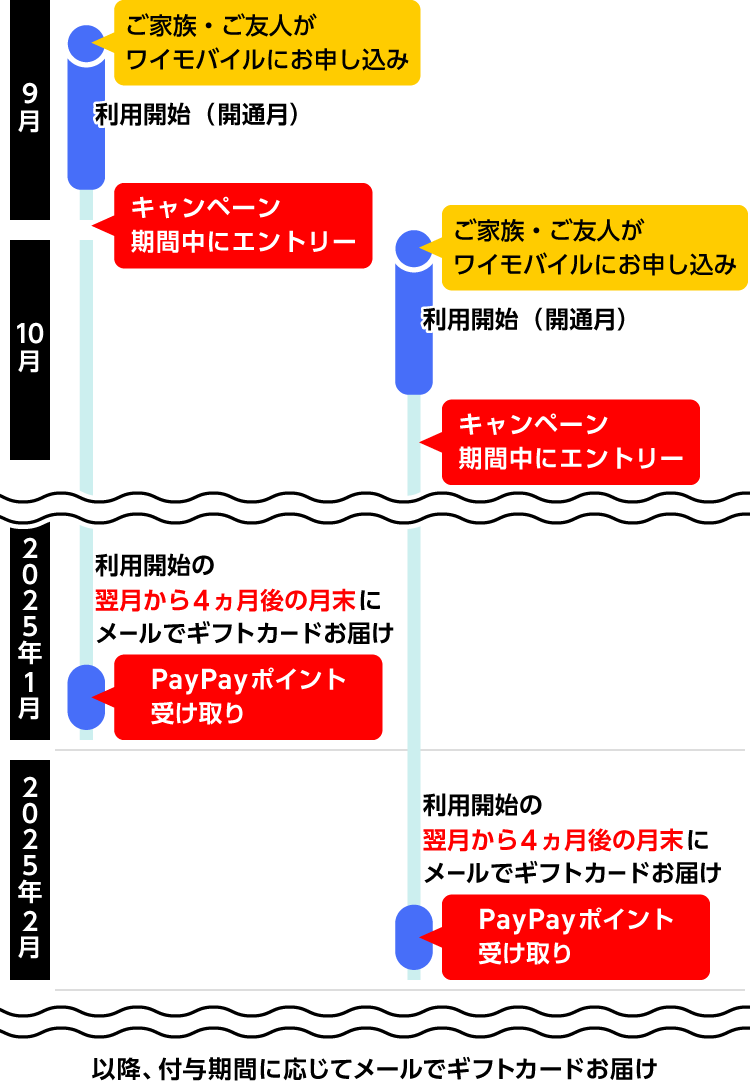 ご家族、ご友人の契約完了月の翌月から4ヵ月※1後にPayPayポイントのギフトコードを受領しポイントを獲得できます。