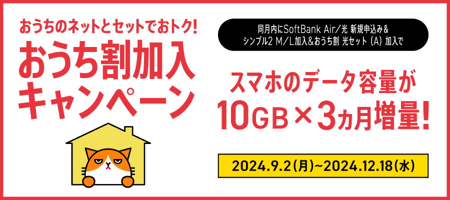 受付期間中、固定通信サービスの SoftBank Air / SoftBank 光*1 / Yahoo! BB 光シティにお申込み、また同月内におうち割光セット(A)とモバイル通信サービスの対象プランにお申し込みをし加入したお客さまが、お申込み月を1ヵ月目として3ヵ月目から5ヵ月目の3ヵ月の間、各月の1日時点で対象プランに加入していた場合、本キャンペーンの特典としてデータ容量の追加購入10GB分(0.5GB 550円×20回購入分)を無料とします。