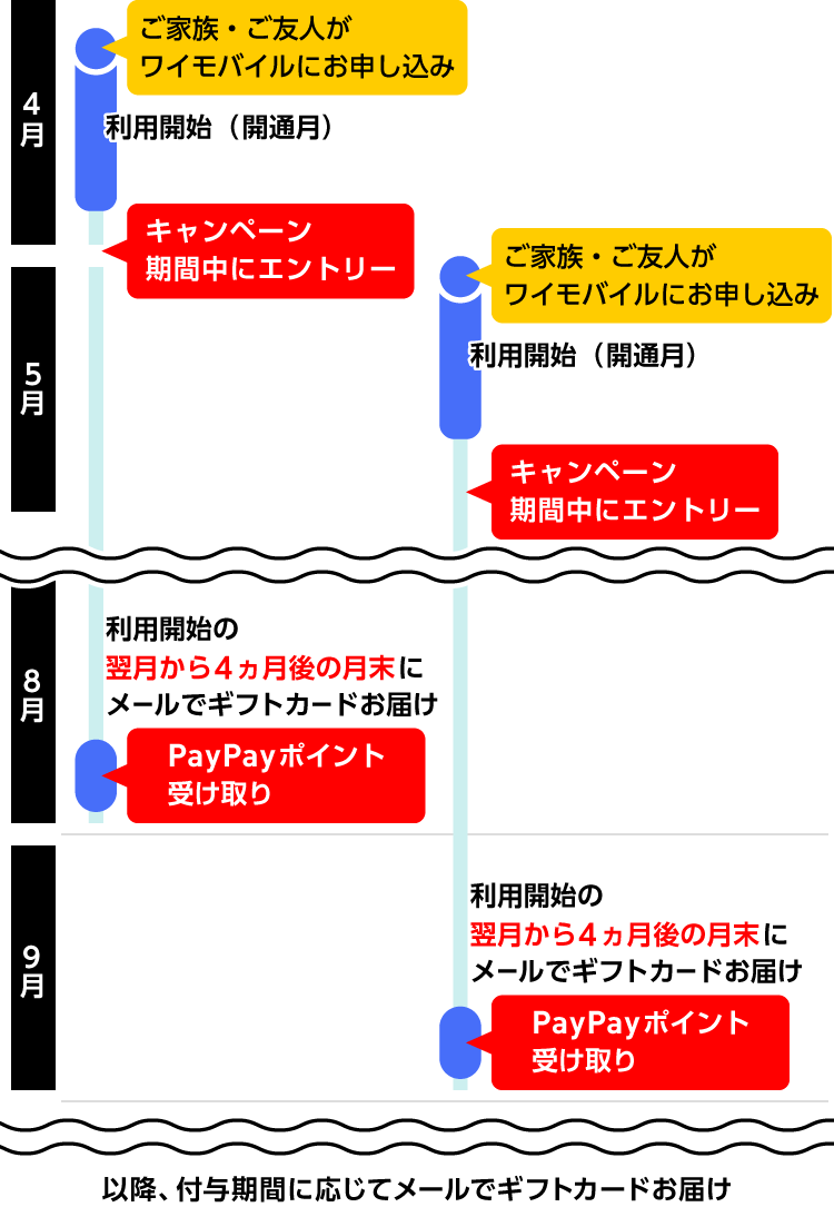 ・対象プラン間のプラン変更の場合は本キャンペーンは適用されません。 ・対象プランに申し込んだ月を1ヵ月目として7ヵ月目に紹介者に対して特典を付与します。 ・本キャンペーンの特典付与は、紹介者1名につき同一メールアドレスおよび同一PayPayアカウントごとに、各月4回までが上限です。 ・被紹介者年齢は対象プラン申込み月の翌月末時点の使用者年齢です。