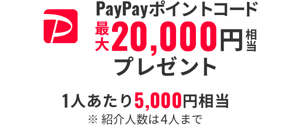 ご家族やお友だちを紹介して、紹介された方がワイモバイルのシンプル2 S/M/Lに加入した場合、紹介した方に1回線あたり最大5,000円相当のPayPayポイントコード(最大4回線まで) をプレゼントいたします。