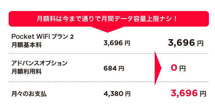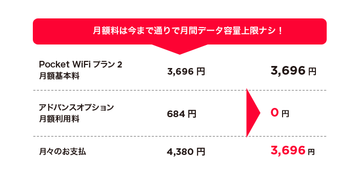 - ※Pocket WiFiプラン2月額基本料は、 Pocket WiFiプラン2(さんねん)の金額です。