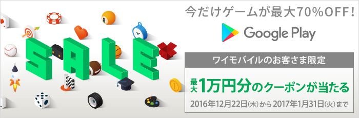 ワイモバイルのスマートフォンをご利用中のお客さまがキャンペーンに応募し、Google Play™ で「ソフトバンクまとめて支払い」をご利用いただくと、対象者全員に120円分の Google Play™ クーポンをプレゼントします。さらに、ダブルチャンスとして抽選で110名さまに最大1万円分の Google Play™ クーポンをプレゼントします。