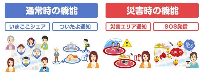 災害時に動けない時などに、SOSを発信しみまもりマップを利用している周辺ユーザへ自分の位置を知らせて助けを呼ぶことができる。