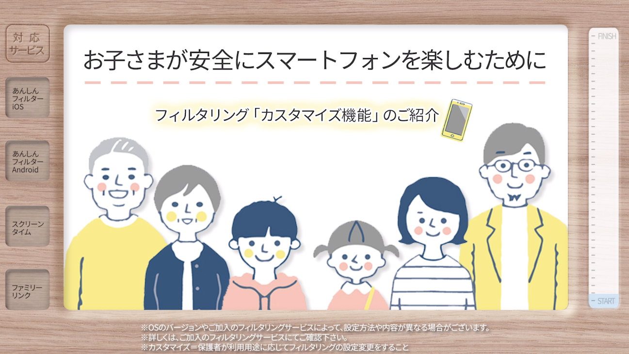 本年度は、フィルタリングサービスにおける便利な機能(カスタマイズ機能など)の紹介や、保護者の方と一緒に各種設定を行い、お子さまの年齢や利用状況に合わせたスマートフォンの利用ができるよう、充実化を図っています。また、保護者の方が未就学のお子さまとスマートフォンを共用で利用する際の注意点について教材に追加するなど、インターネット利用の低年齢化に伴う取り組みの強化も実施しています。