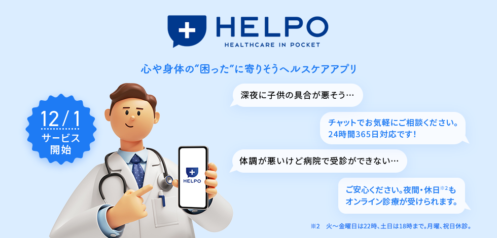 「HELPO」は、チャットによる健康医療相談やオンライン診療、病院検索、一般用医薬品などの購入をワンストップでできるヘルスケアアプリ(月額利用料:550円)です。