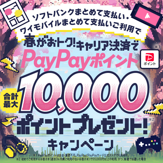期間中にキャンペーンページからご応募いただき、App Store/Google Playにてキャリア決済(ソフトバンク/ワイモバイルまとめて支払い)を初めてご利用のお客さま、または過去3ヵ月間(2025/1/1~2025/4/23)でキャリア決済のご利用がないお客さまに、ご利用金額に応じて最大5,000ポイントのPayPayポイントをプレゼント!※1
