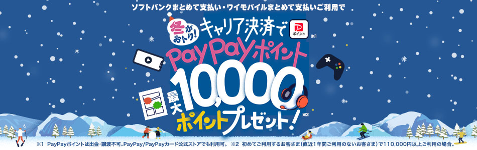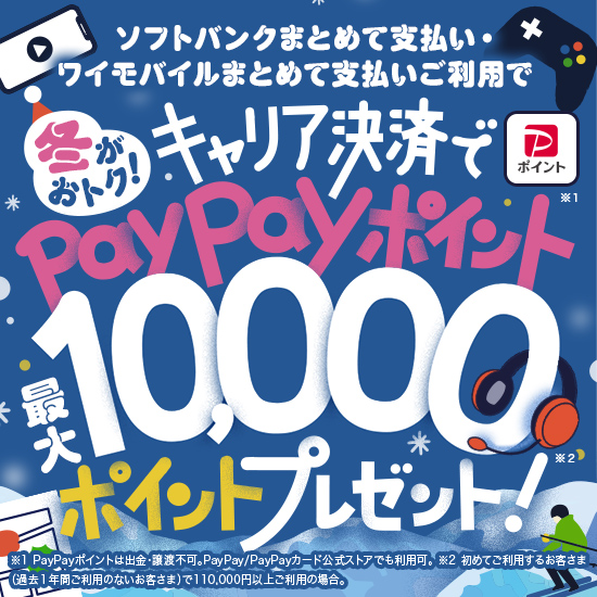 期間中にキャンペーンページからご応募いただき、App Store/Google Playにてキャリア決済(ソフトバンク/ワイモバイルまとめて支払い)を初めてご利用のお客さま、または直近1年(2024/12/1~2025/11/26)でキャリア決済のご利用がないお客さまに、ご利用金額に応じて最大10,000ポイントのPayPayポイントをプレゼント!※1