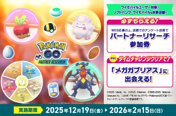 いつもトレーナーの皆さんを応援しているソフトバンクでは、「『Pokémon GO』パートナーリサーチ」の参加券がもらえるキャンペーンを2025年12月19日(金)