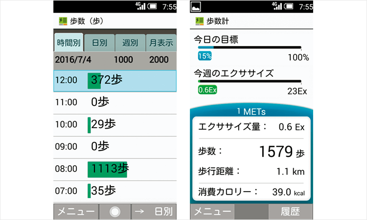 歩数のほかに消費カロリーも測定できる歩数計を搭載。時間別、日別、週別、月別単位で表示できて、健康管理に便利です。歩数はサブディスプレイにも表示されるので、気になったらすぐに確認できます。