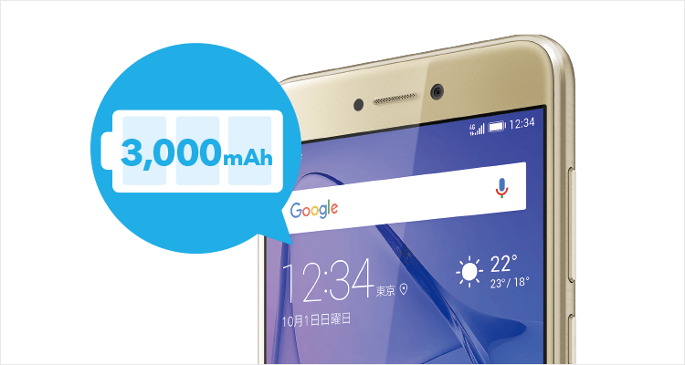 コンパクトながら3,000mAhのバッテリーを搭載し、CPUはオクタコアKirin655を採用。快適な操作感でゲームやブラウジングも安心して楽しめます。