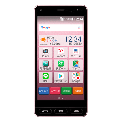 大きな文字と必要なアプリに絞ったシンプルなホーム画面。よく使う連絡先を4件まで登録できる。