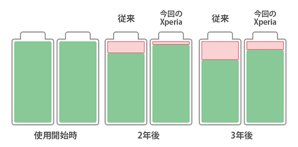 バッテリーの負荷を軽減する「いたわり充電」とXperia独自の「充電最適化技術」により、3年*1使っても劣化しにくい長持ちバッテリーを実現。