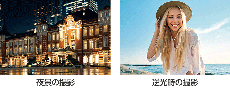 夜景撮影は、ナイトモードとF値 1.8の明るいレンズ、ノイズ低減技術で鮮明に。逆光時には、オートHDRが活躍。明暗を自動で判断・合成し、白飛びや黒つぶれの少ない、自然な仕上がりに。