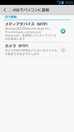 「USBでパソコンに接続」画面が表示されますので、「メディアデバイス(MTP)」を選択するとパソコン上に「新しいハードウェアの検出ウィザード」が表示されます。解凍したドライバファイルを選択して、ドライバをインストールしてください。