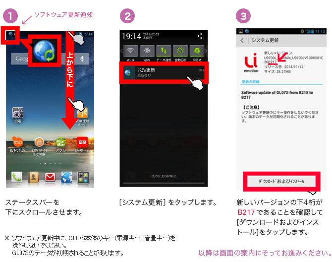 emobile メールおよび emobile メッセージをご利用のお客さまは、ソフトウェア更新完了後、emobile メールおよび emobile メッセージをアップデートしてください。