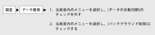 ■ バックグラウンドデータ、自動同期をOFFにする。 |