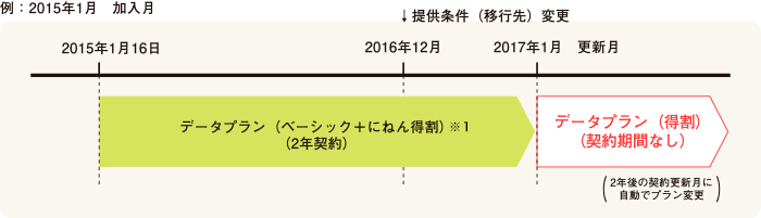 2016年12月以降に更新時期を迎える「データプラン(ベーシック+にねん得割)※1」については、自動移行先のプランを契約期間がなく、解約時に契約解除料のかからない「データプラン(得割)」とさせていただきます。