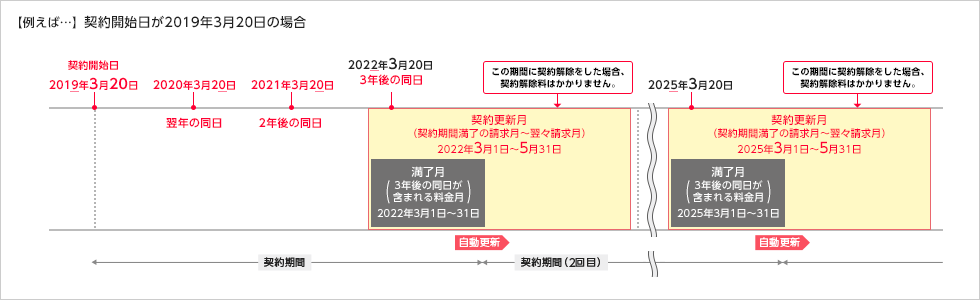 - ●契約期間は、契約開始日から算出し、3年後の同日が含まれる料金月を「満了月」とします。