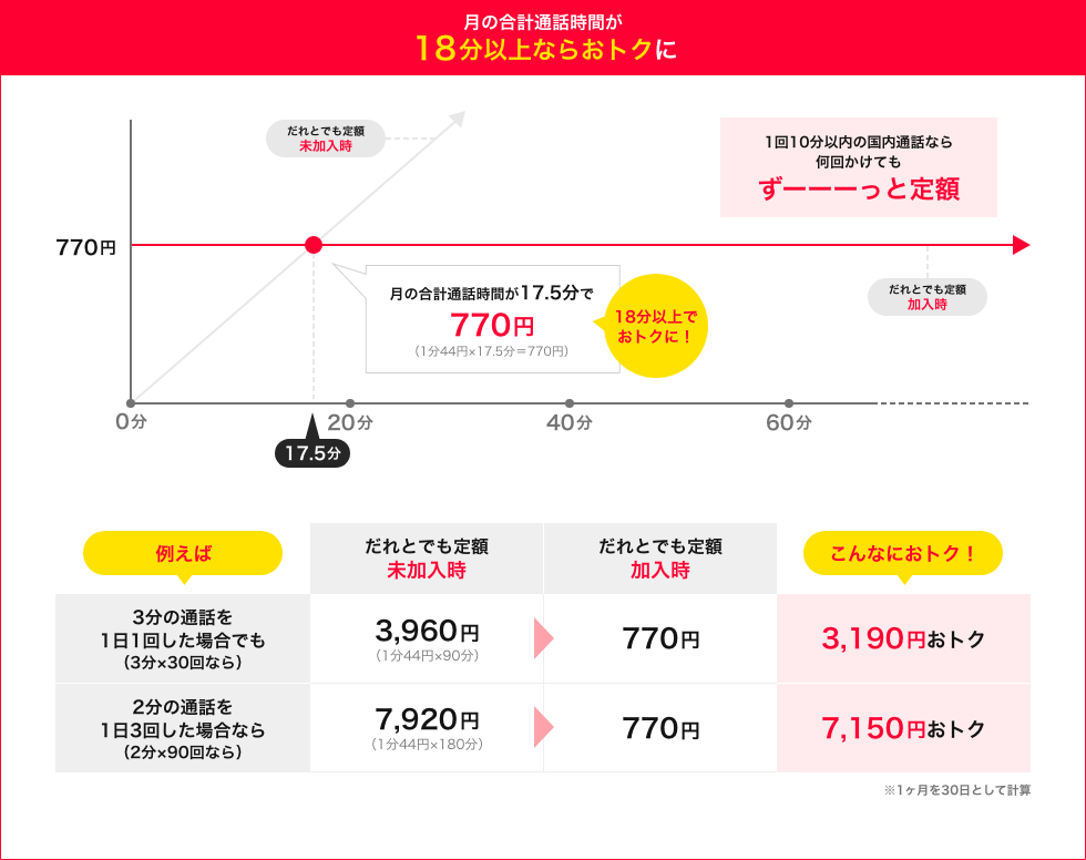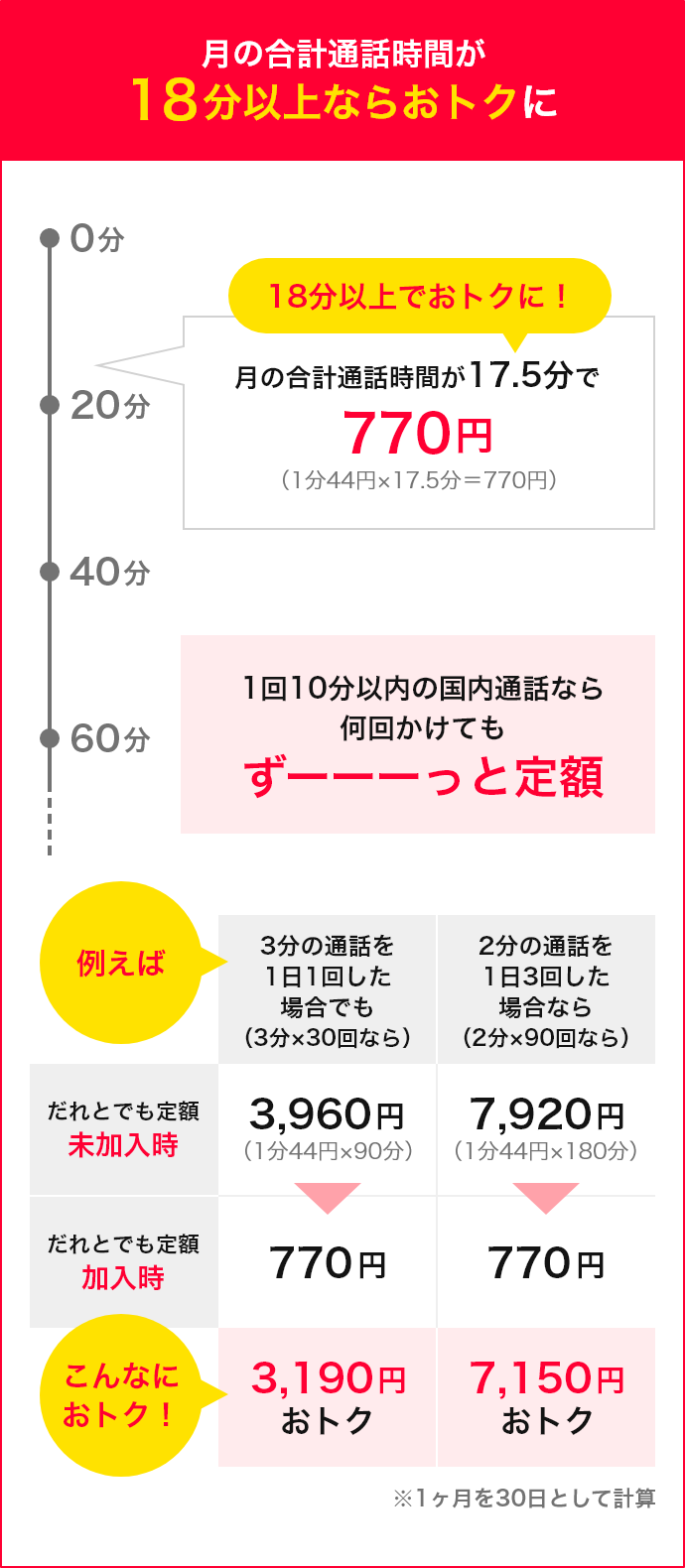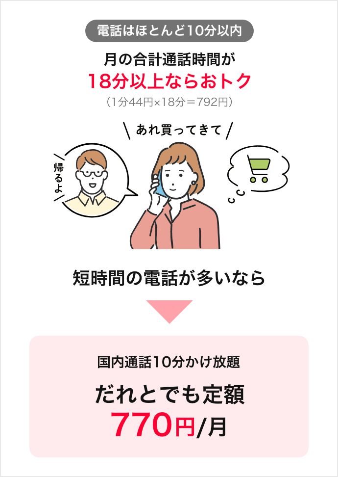 - ● 1回あたり10分を超える国内通話は、10分超過分において、30秒につき22円の通話料が別途かかります。