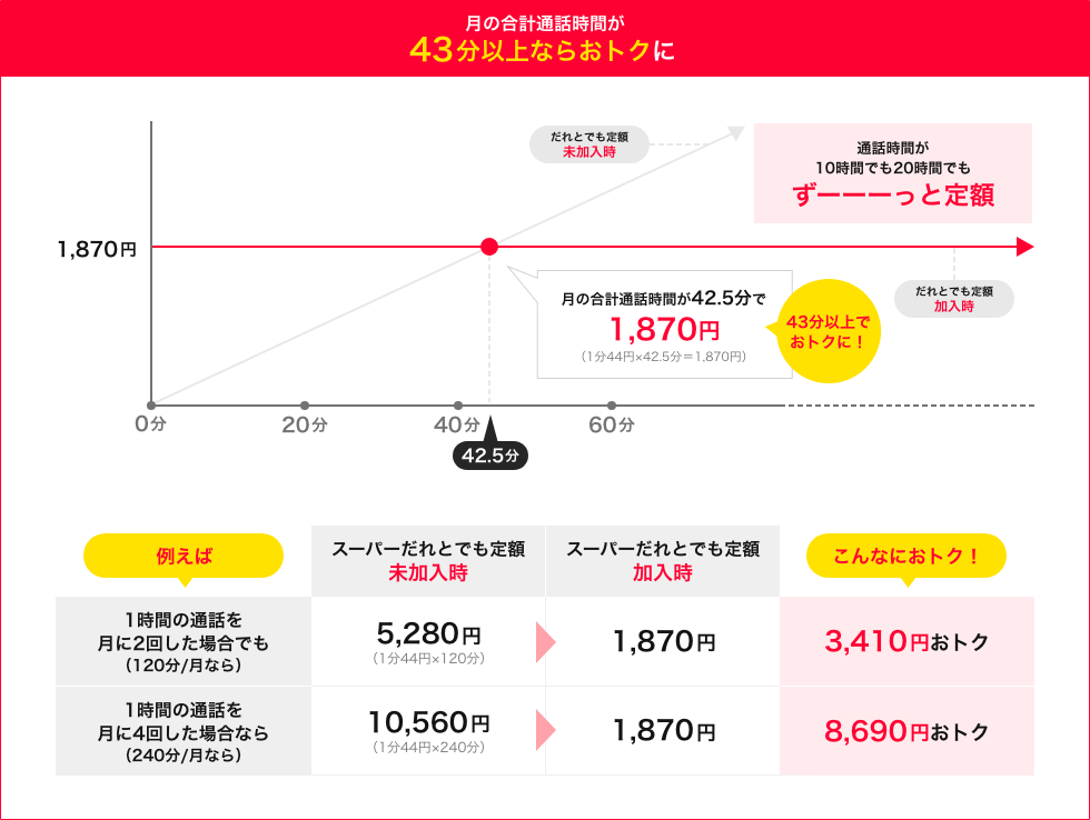 - ● スマホベーシックプラン、スマホプラン、ケータイベーシックプランSS、ケータイプランSSで提供の通話オプションは「スーパーだれとでも定額」をご確認ください。