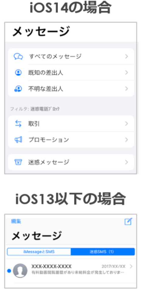 ・ 「+メッセージ(バージョン11.1.2以上)」をご利用の場合には迷惑メール受信時に自動で振り分けが行われるため通知は行われません。