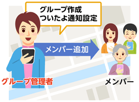 「セキュリティパックプラス」や「スマートフォン基本パック-S」または「位置ナビ」にご加入いただいているお客さまは、グループ管理者になることができ、グループへのメンバー登録・編集などを行うことができます。