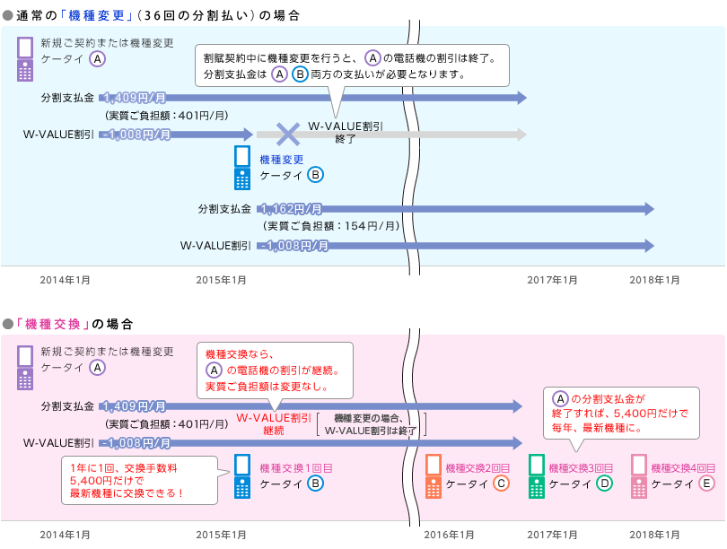 「機種変更」時、「機種交換」時の、電話機購入代金のお支払とW-VALUE割引の適用イメージの違いをご説明します。