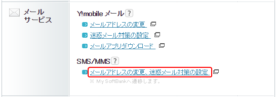 サービス一覧より、「メールサービス」の「メールアドレスの変更、迷惑メール対策の設定」を選択します。(My SoftBankの画面に切り替わります。)