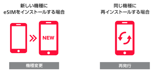 修理など何らかの事情でeSIMを消去してしまい、ご契約時と同じ機種にあらためてインストールする場合は再発行となります。eSIMの再発行方法のページをご確認ください。