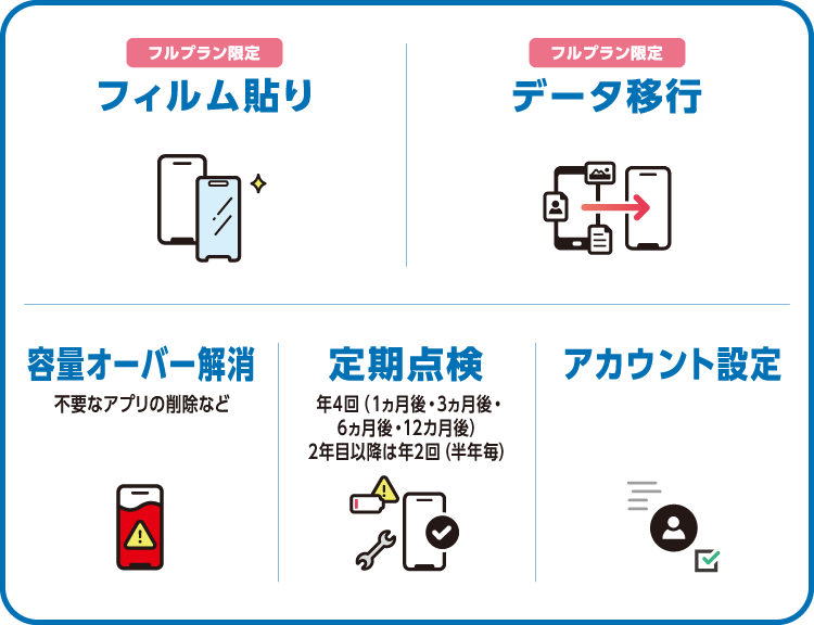 • ・ 本サービスのフルプランが解約又は解除された場合には、フルプランに属するケータイなんでもサポートの利用ができなくなります。