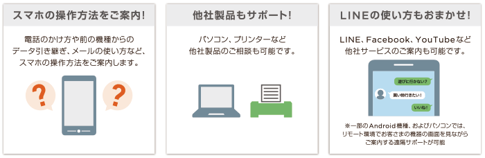 | スマートフォン、タブレット端末 | 操作方法説明、各種設定、各種トラブルシュート、スマートフォン、タブレット端末の画面を遠隔操作しながらお電話でサポートする「遠隔サポート」など |