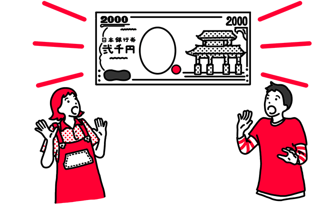 西暦2000年と沖縄サミットをきっかけに2000円札が発行されました。見かけることが少なくなりましたが、沖縄では現在でも多く使われています。