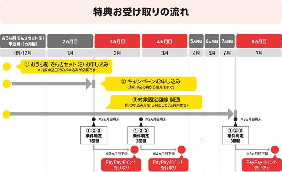 - ・特典は、おうち割でんきセット(E)の申込み月を1ヵ月目として2ヵ月目末時点、3ヵ月目末時点、もしくは7ヵ月目末時点で対象電力サービスの利用開始が確認できた月の翌月に付与いたします。