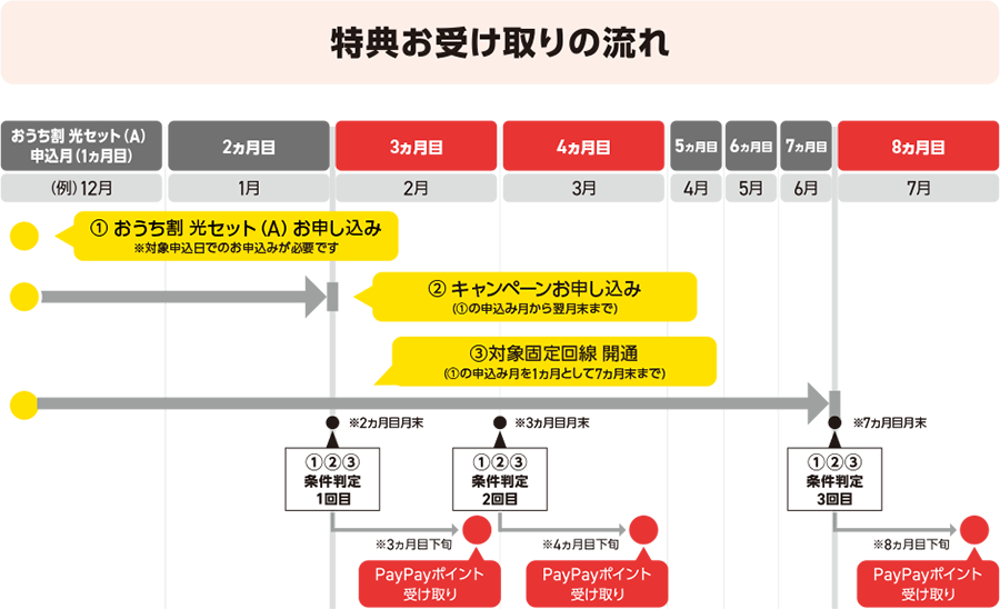 - ・特典は、おうち割光セット(A)の申込み月を1ヵ月目として2ヵ月目末時点、3ヵ月目末時点、もしくは7ヵ月目末時点で固定通信サービスの開通が確認できた月の翌月に付与いたします。