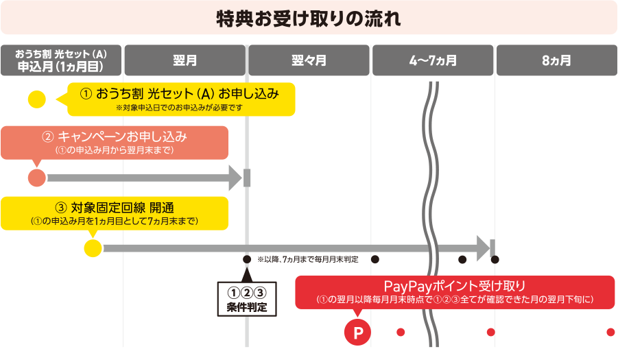 - ・特典は、おうち割光セット(A)の申込月を1ヵ月目として2ヵ月目末時点、3ヵ月目末時点、もしくは7ヵ月目末時点で固定通信サービスの開通が確認できた月の翌月に付与いたします。
