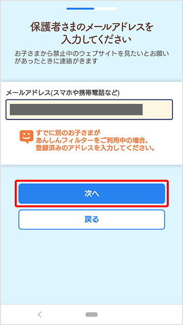 保護者さまのメールアドレスを入力後に「次へ」を選択