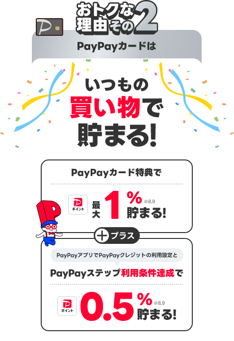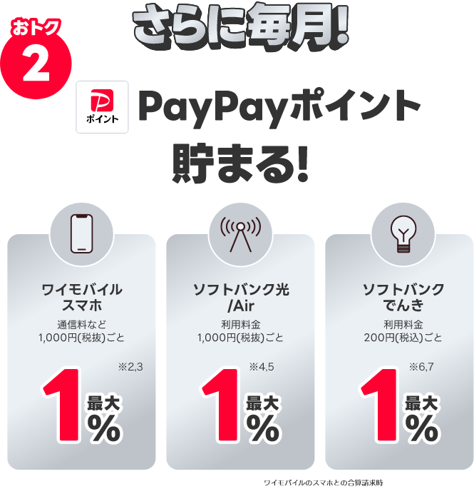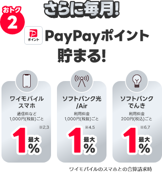 スマホ・光/Airのご利用料金1,000円(税抜)ごとに各付与率を乗算したポイントを付与。PayPayカードのアカウント連携要。PayPayポイントで受け取るには自動交換設定が必要です。