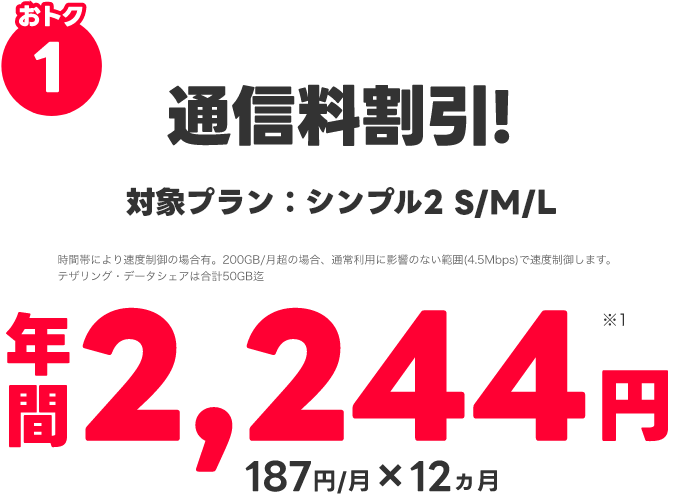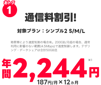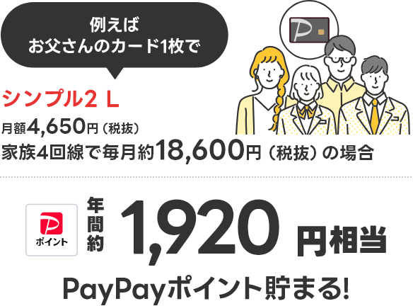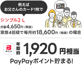 シンプル2 L 4,650円/月(税抜) - PayPayカード割 170円/月(税抜) = 4,480円/月(税抜)