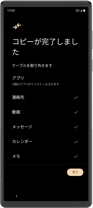 機種変更時は 1 本のケーブルを挿すだけで大切な写真やスケジュール、連絡先をスムーズに移行できる。( Wi-Fi 経由でも移行可能)