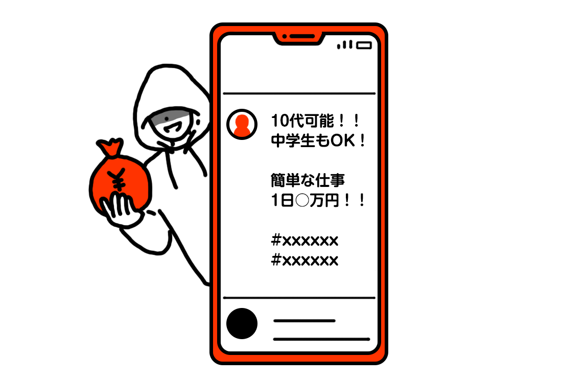 「闇バイト」は知っていますね。「短時間で簡単にかせげる」などと誘い、犯罪に巻き込むもの。インターネットの掲示板やSNSで、「闇バイトではありません」と書かれていても信じてはいけません。申し込みのときに、聞いたことがないアプリのインストールを求められた場合は「闇バイト」の可能性があります。アルバイトは必ず、家族や友人に相談してからにしましょう。