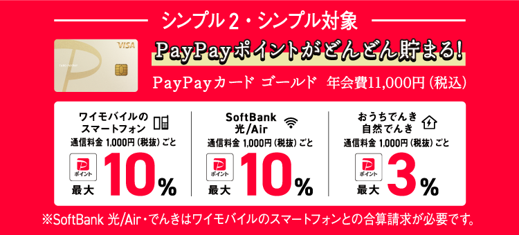 • ※1 Y!mobileサービスの初期登録で適用(追加料金なし)。一部対象外のプランあり。対象金額※7のうち、PayPay(クレジット/残高/ポイント)、PayPayカード(旧Yahoo! JAPANカード含む)、PayPayカード ゴールド、ヤフーショッピング商品券での決済額に対し付与。
