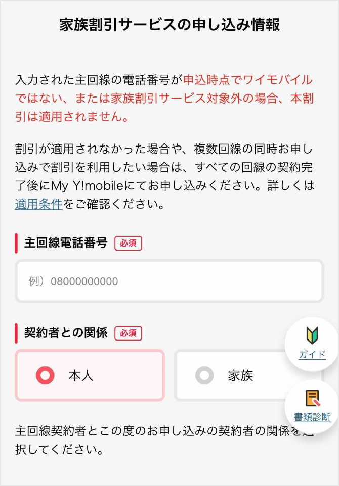 オンラインストアでは、新しく契約する回線を副回線とする場合のみ家族割引のお申し込みが可能です。