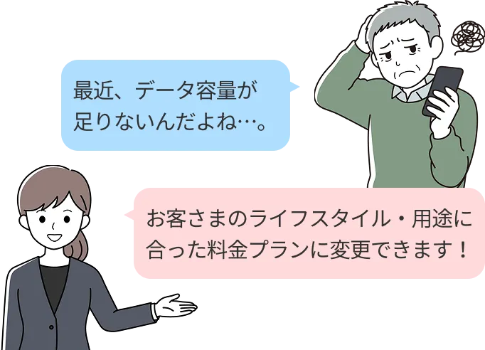 お客さまのご契約情報およびデータ量、通話料のご利用実績に基づき、おすすめの料金プランと通話オプションを案内するサービスです。