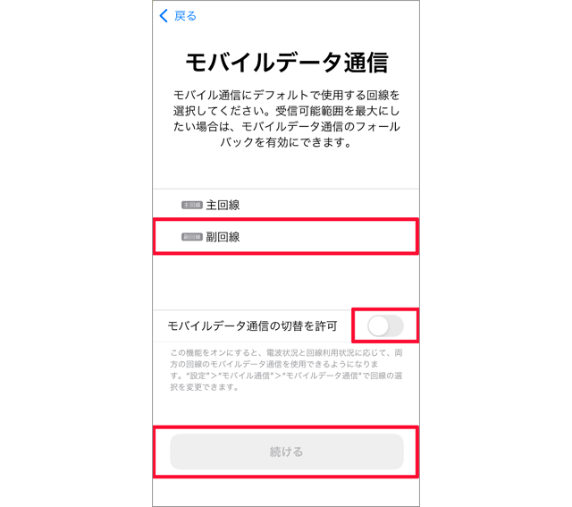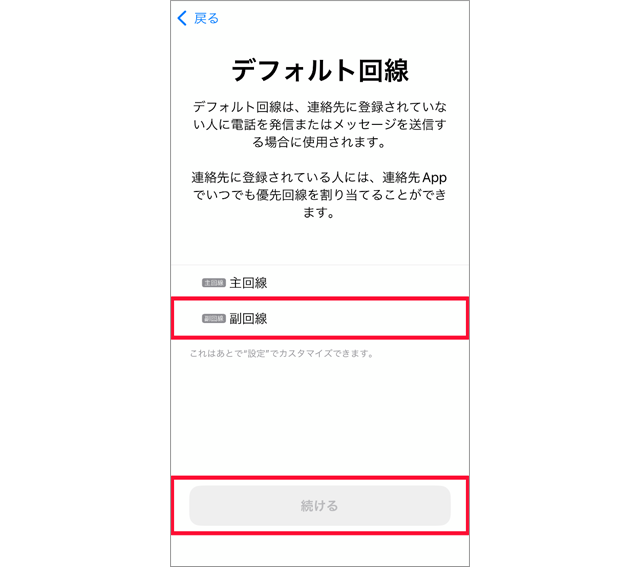 電話とメッセージ(SMS)に使用する回線を設定します。「副回線」を選択して、「続ける」をタップしてください。