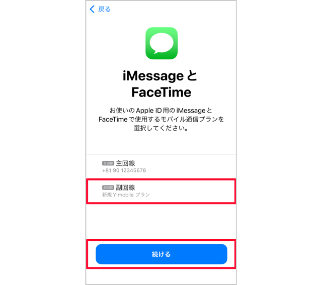 iMessageとFaceTimeに使用する回線を設定します。「副回線」を選択して、「続ける」をタップしてください。